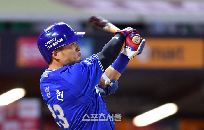 삼성 9번타자 이병헌이 16일 인천SSG랜더스필드에서 열리는 2024 프로야구 SSG랜더스와 삼성라이온즈 경기 5회초 내야안타로 출루하고 있다. 2024.05.16.