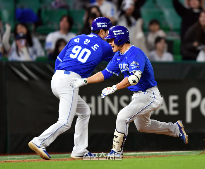 삼성 7번타자 이성규가 16일 인천SSG랜더스필드에서 열리는 2024 프로야구 SSG랜더스와 삼성라이온즈 경기 8회초 2사 2루에서 역전 투런홈런을 터트린 후 홈인하고 있다. 2024.05.16.