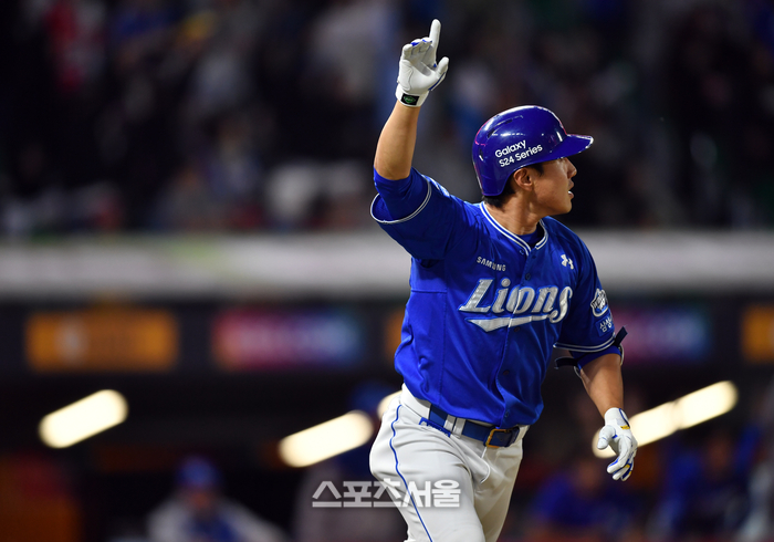삼성 7번타자 이성규가 16일 인천SSG랜더스필드에서 열리는 2024 프로야구 SSG랜더스와 삼성라이온즈 경기 8회초 2사 2루에서 역전 투런홈런을 터트린 후 홈인하고 있다. 2024.05.16.