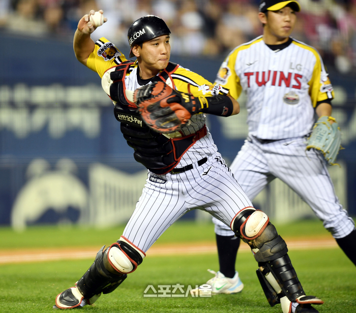 LG 포수 전준호가 16일 잠실야구장에서 열린 2024 KBO리그 키움과 경기 9회초 2사 상대 김재현의 타구를 1루로 송구하고 있다.