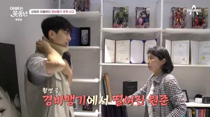 김원준의 엄마는 “경비행기 떨어져서 (목 보호대를 찼다). 아들 건강 챙겨준 거니까 소중하다”고 보관하고 있던 이유를 설명했다.