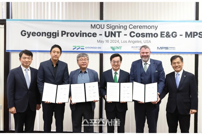 프리미엄아울렛 투자유치에 앞서 김 지사는 같은 장소에서 ㈜코스모이엔지 양기일 대표, 마이클 론델리 미국 노스텍사스대 처장, 최원봉 미국 노스텍사스대 교수, ㈜엠피에스 LA 박정민 지사장과 함께 ㈜코스모이엔지와 2차전지 신소재 생산·연구시설 설립에 따른 투자협약을 체결했다.