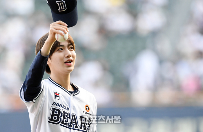 그룹 크래비티의 원진이 17일 잠실구장에서 열린 2024 KBO리그 롯데 자이언츠와 두산 베어스의 경기에 앞서 시구를 한 뒤 관중석을 향해 인사를 하고 있다. 시타는 크래비티의 형준이 맡았다. 2024. 5. 17.