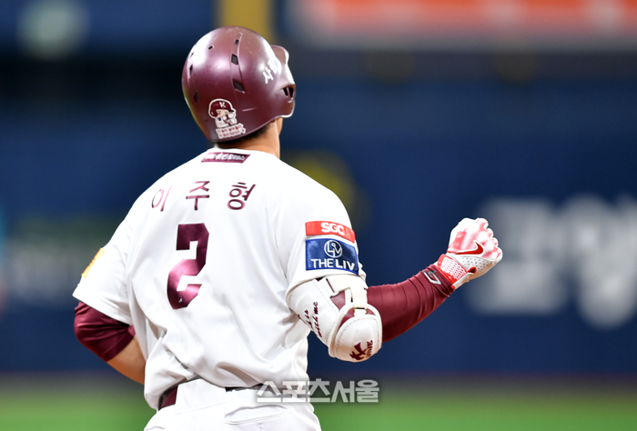 키움 4번타자 이주형이 19일 고척스카이돔에서 열린 2024 프로야구 키움히어로즈와 SSG랜더스 경기 2회말 선두타자로 나와 오원석을 상대로 중월 동점 솔로홈런을 터트린 후 홈인하고 있다. 2024.05.19.