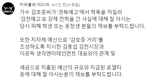 20일 유튜버 카라큘라는 커뮤니티에 “가수 김호중씨가 ‘경북예고’에서 학폭을 저질러 ‘김천예고’로 강제 전학을 간 사실에 대해 잘 아시는 당시 피해 학생 또는 동창생 분들의 제보를 부탁드린다”는 게시물을 올렸다.