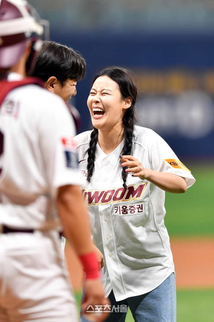코미디언부부 이혜지 정호철 부부가 21일 고척스카이돔에서 열린 2024 프로야구 키움히어로즈와 NC다이노스의 경기에서 부부의 날 기념 시구-시타를 하고 있다. 2024.05.21.