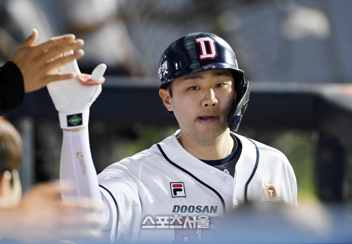 두산 베어스 양석환이 21일 잠실구장에서 열린 2024 KBO리그 SSG 랜더스와 경기 4회말 1사 SSG 선발투수 이건욱을 상대로 선제 솔로 홈런을 치고 동료들과 하이파이브를 하고 있다. 양석환의 시즌 11호 홈런. 2024. 5. 21.