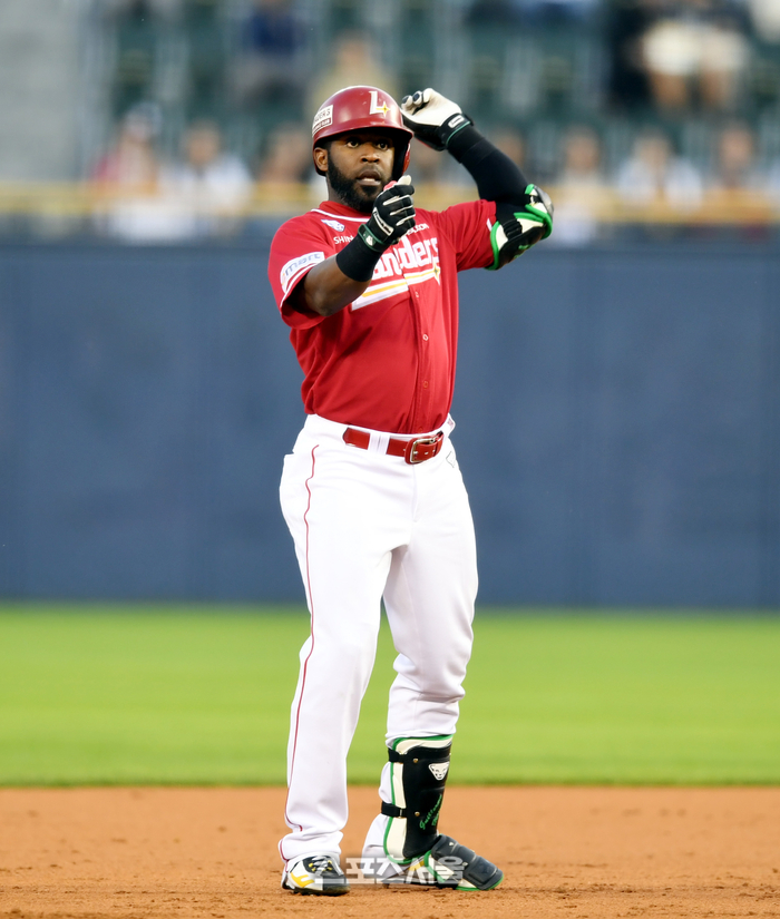SSG 에레디아가 22일 잠실야구장에서 열린 2024 KBO리그 두산과 경기 4회초 2사 좌중간 2루타를 친 후 세리머니를 하고 있다.