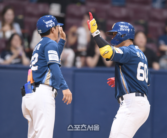 NC 박한결이 23일 고척스카이돔에서 열린 2024 KBO리그 키움과 경기 5회초 좌월홈런을 날린 후 전상렬 코치와 하이파이브를 하고 있다.