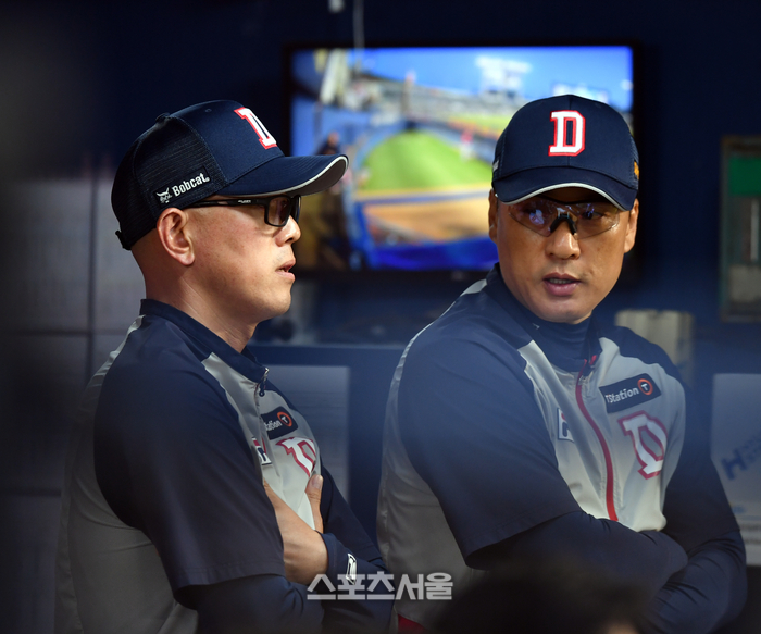 두산 이승엽 감독이 23일 잠실구장에서 열린 2024 프로야구 두산베어스와 SSG랜더스 경기 4회초 역투하는 최준호를 두고 박정배 투수코치와 이야기를 나누고 있다. 2024.05.23.