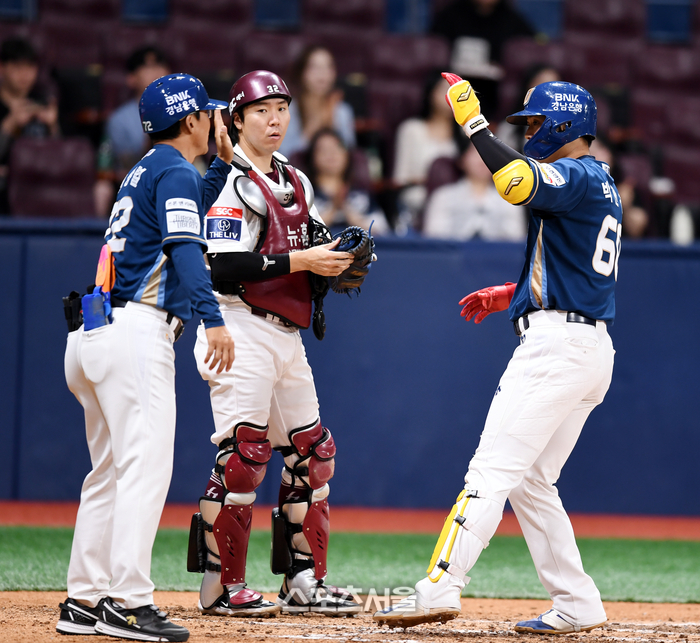 NC 박한결이 23일 고척스카이돔에서 열린 2024 KBO리그 키움과 경기 7회초 1사 중월홈런을 날린 후 전상렬 코치와 하이파이브를 하고 있다.