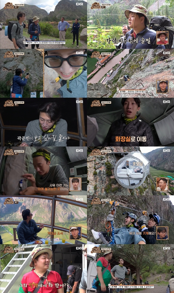 그중 ‘꽉기영’ 팀 곽튜브와 강기영은 페루 ‘나라카드’의 숙소 제공 혜택으로 뽑은 ‘오얀타이탐보’의 절벽 호텔에 방문했다. 122m 높이의 절벽 위에 있는 이 호텔은 오직 암벽 등반으로만 체크인을 할 수 있는 ‘세상에서 가장 괴팍한 숙소’. 고산병도 이겨내며 페루 여행을 이어가던 곽튜브지만, 고소공포증의 벽은 높았다.