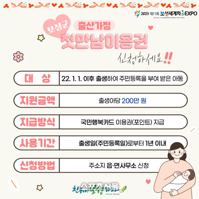 출산한 산모에게는 ▲첫만남이용권(첫째아 200만원, 둘째아 이상 300만원), ▲공공산후조리원 이용료(최대 107만원) 또는 보성군산후조리비용지원(첫째아 80만원, 둘째아 이상 100만원), ▲저소득층 기저귀·조제분유(24개월까지 기저귀 월 9만원, 조제분유 및 조제 이유식 11만 원) 등을 지원한다.