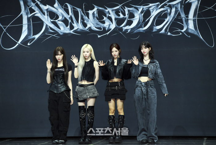 그룹 에스파가 27일 서울 용산구 블루스퀘어 마스터카드홀에서 진행된 첫 정규 앨범 ‘아마겟돈(Armageddon)’ 발매 기념 미디어 쇼케이스에서 취재진을 향해 포즈를 취하고 있다. 왼쪽부터 지젤, 윈터, 닝닝, 카리나.