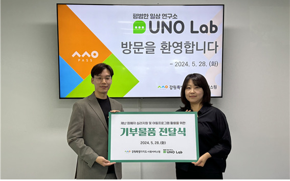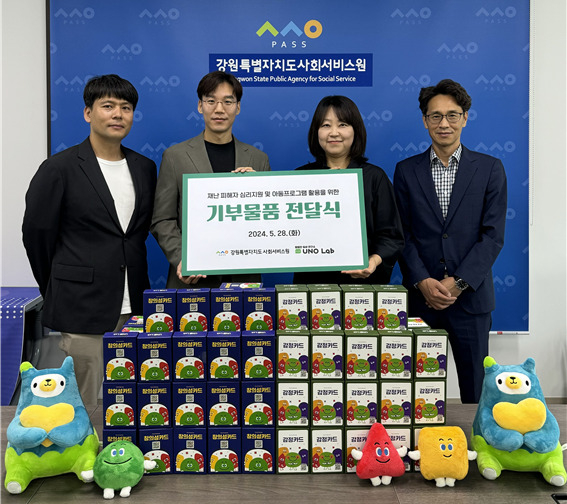 [스포츠서울ㅣ춘천=김기원기자] 강원특별자치도사회서비스원(원장 이은영, 이하 도사회서비스원)과 ㈜유노랩(대표 이윤호)은 28일, 도 내 재난 피해자 심리지원 및 아동 프로그램 활용을 위한 기부물품 전달식을 가졌다.
