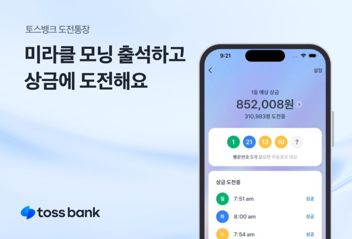 [스포츠서울 | 최규리 기자] 토스뱅크는 매일 아침 미라클 모닝을 실천하는 고객을 추첨하여 상금을 지급하는 ‘도전통장’을 출시했다고 28일 밝혔다.