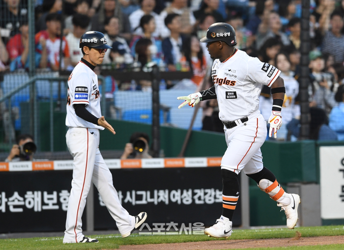 한화 이글스 페라자가 28일 대전 한화생명이글스파크에서 열리는 2024 KBO리그 롯데 자이언츠와 경기 3회말 무사 롯데 선발 박세웅을 상대로 솔로 홈런을 치고 김재걸 코치와 세리머니를 하고 있다. 2024. 5. 28.