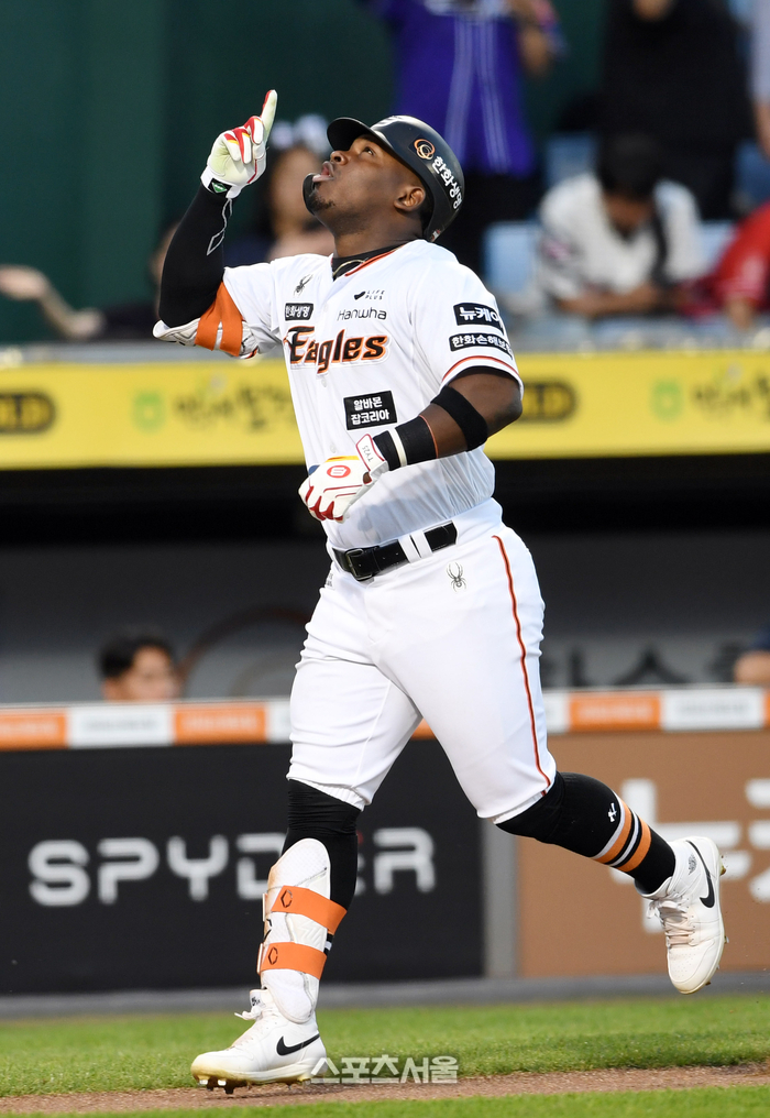 한화 이글스 페라자가 28일 대전 한화생명이글스파크에서 열리는 2024 KBO리그 롯데 자이언츠와 경기 3회말 무사 롯데 선발 박세웅을 상대로 솔로 홈런을 치고 세리머니를 하고 있다. 2024. 5. 28.