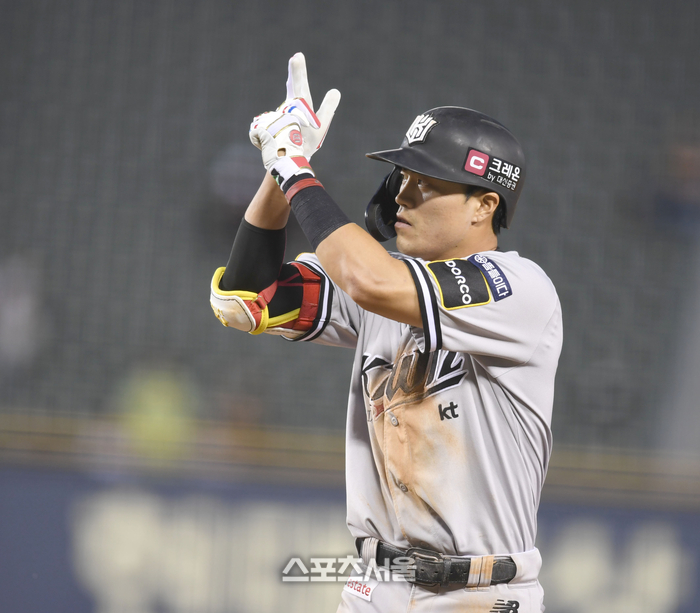 KT 천성호가 28일 잠실야구장에서 열린 2024 KBO리그 두산과 경기 5회초 무사1루 우전안타를 친 후 세리머니를 하고 있다.