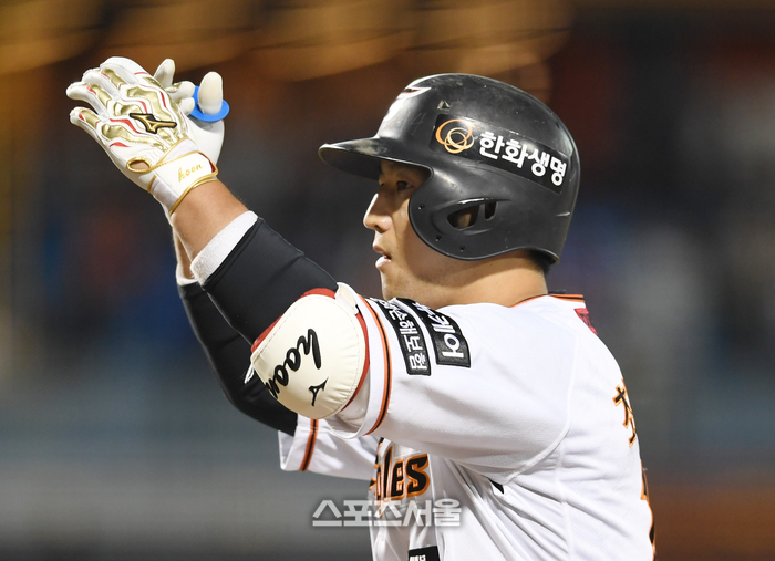 한화 이글스 최재훈이 28일 대전 한화생명이글스파크에서 열리는 2024 KBO리그 롯데 자이언츠와 경기 5회말 1사 만루 상황에서 롯데 선발 박세웅을 상대로 1타점 적시타를 치고 세리머니하고 있다. 2024. 5. 28.