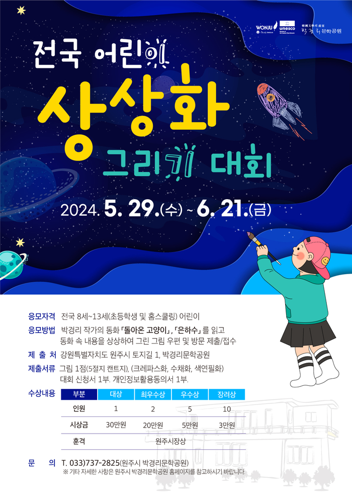 박경리 선생 선양 사업의 일환으로 추진하는 이번 공모전은 8세~13세(초등학생 및 홈스쿨링) 어린이를 대상으로 진행되며, 박경리 선생의 동화「돌아온 고양이」와 「은하수」를 읽고 그린 상상화와 신청서 등을 제출하면 된다.