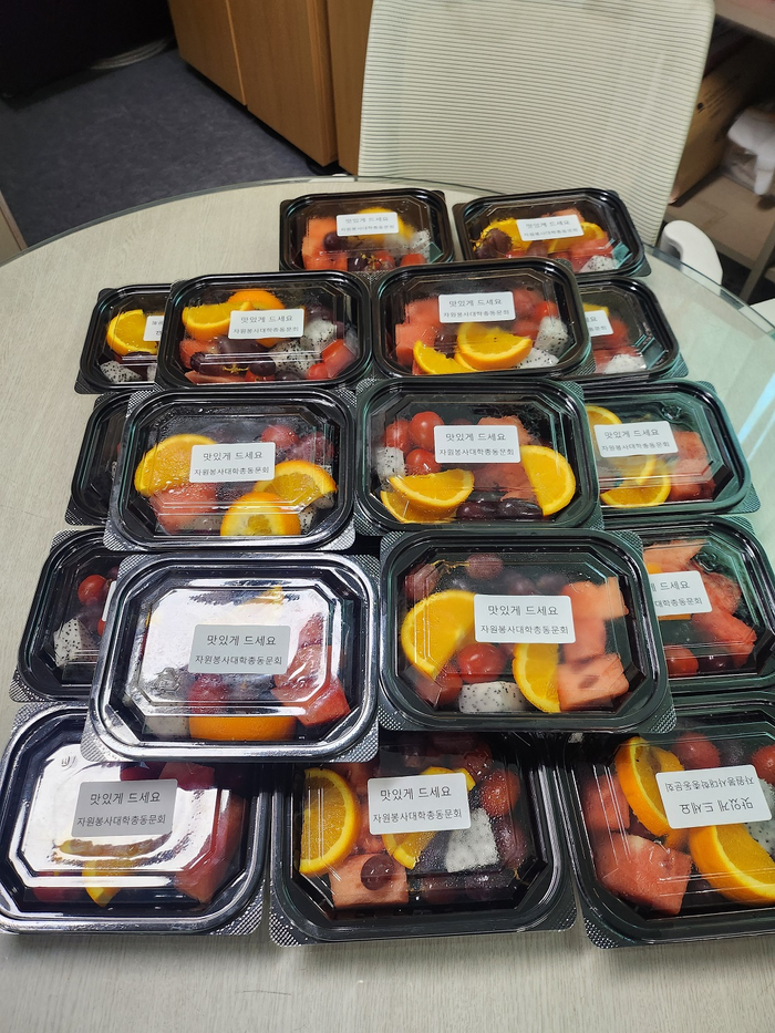 이번 후원은 자원봉사대학 총동문회에서 최근 고물가 시기에 경제적 부담으로 구입이 어려운 신선한 과일을 동호동의 어려운 이웃들에게 전달하고자 여러 과일을 한곳에 담은 도시락을 손수 만들어서 기부하였다.