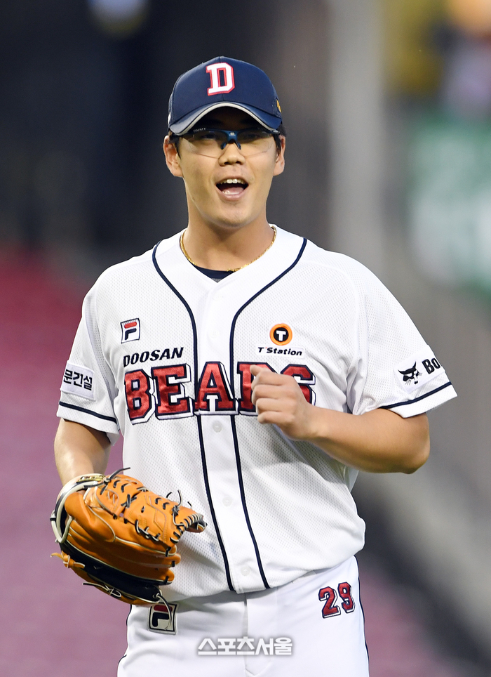 두산 베어스 이병헌이 29일 잠실구장에서 열린 2024 KBO리그 KT 위즈와 경기 4회초 2사 1-2루 상황에서 등판해 KT 로하스를 삼진아웃으로 잡아내며 위기를 넘긴 뒤 밝게 웃고 있다. 2024. 5. 29.