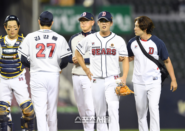 두산 베어스 이병헌(오른쪽 둘째)이 29일 잠실구장에서 열린 2024 KBO리그 KT 위즈와 경기 5회초 2사 만루 상황에서 김강률과 교체되면서 복부 통증으로 인상을 찌푸리고 있다. 2024. 5. 29.