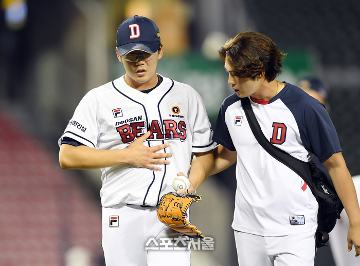 두산 베어스 이병헌(왼쪽)이 29일 잠실구장에서 열린 2024 KBO리그 KT 위즈와 경기 5회초 2사 만루 상황에서 김강률과 교체되면서 복부 통증을 호소하고 있다. 2024. 5. 29.