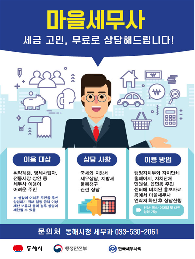 마을세무사 무료 세무 상담을 희망하는 시민은 동해시 홈페이지나 세무과 세정팀(☎530-2061)에 마을세무사 명단을 확인 후 전화나 팩스, 이메일로 세무 상담을 받으면 된다. 보다 심층 상담을 원하는 경우 마을세무사 사무소 방문을 통한 대면 상담도 가능하다.