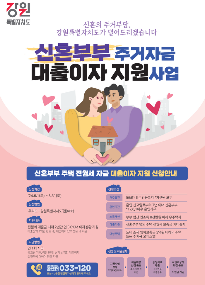 본 사업은 오는 6월 1일부터 8월 31일까지 우리도(강원특별자치도) 애플리케이션으로 신청 가능하며, 지원이 결정되면 지난 1년간의 이자 상환 비용이 지원(연간 1회, 300만원 한도 내)되며, 신혼부부 한 가구당 2년 동안 총 2회 지급된다.