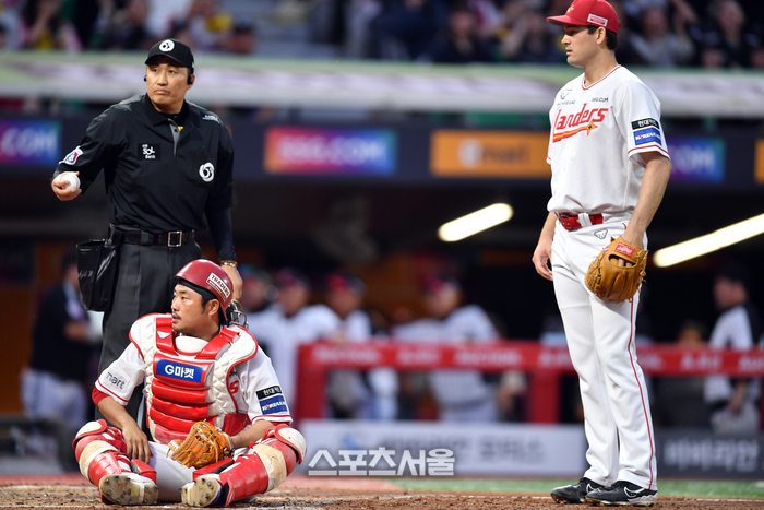 SSG 포수 이지영이 30일 인천SSG랜더스필드에서 2024 프로야구 SSG랜더스와 LG트윈스 경기 5회초 1사 3루 LG 9번타자 신민재 타석때 글러브 맞고 튄 공을 못찾아 3루주자 구본혁의 홈스틸을 허용하고 아쉬워하고 있다. 2024.05.30.
