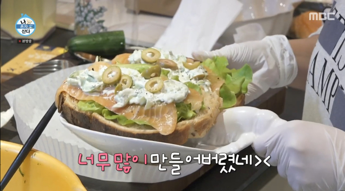 이어 채칼에 오이를 썰어 훈제 연어 차지키 호밀빵 샌드위치를 만들었다. 박나래는 “호밀빵이 다이어트에 좋다”고 설명했다.