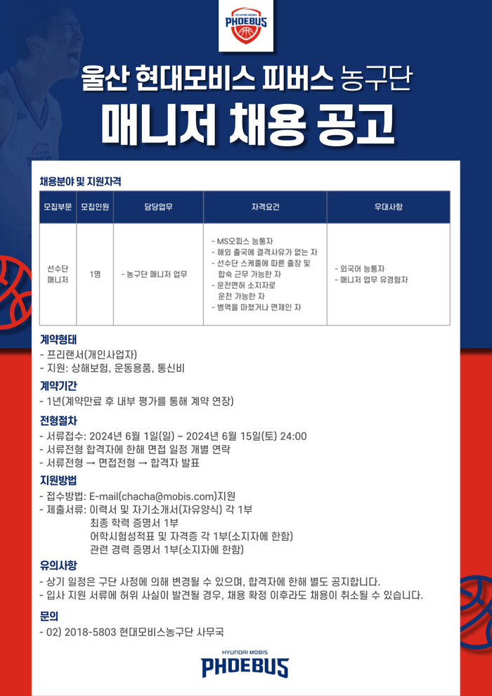 [스포츠서울 | 이웅희 기자] 울산 현대모비스 피버스 프로농구단이 선수단을 지원할 매니저를 모집한다.