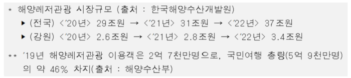 강원특별자치도는 이 같은 중앙정부의 정책흐름 및 변화하는 관광트렌드에 대한 발빠른 대응과 강원 해양레저관광산업 발전을 위해 ʹ동해안 해양레저관광 활성화 전략ʹ을 수립하여 본격 추진할 계획이다.