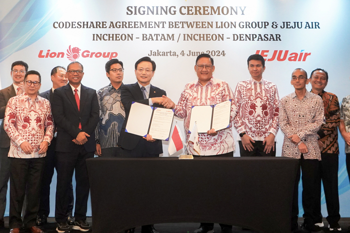 제주항공은 지난 4일(현지시각) 인도네시아 자카르타 페어몬트 호텔에서 김이배 제주항공 대표이사와 Capt.Daniel Putut Kuncoro Adi 라이온에어 그룹회장, 조성태 주인도네시아 대한민국 대사관 국토교통관, Putu Eka Cahyadhi, S.T., M.E, 인도네시아 교통부 항공교통국장 등이 참석해 ‘인천~발리 및 바탐 노선 공동운항을 위한 운수협정’을 체결했다.