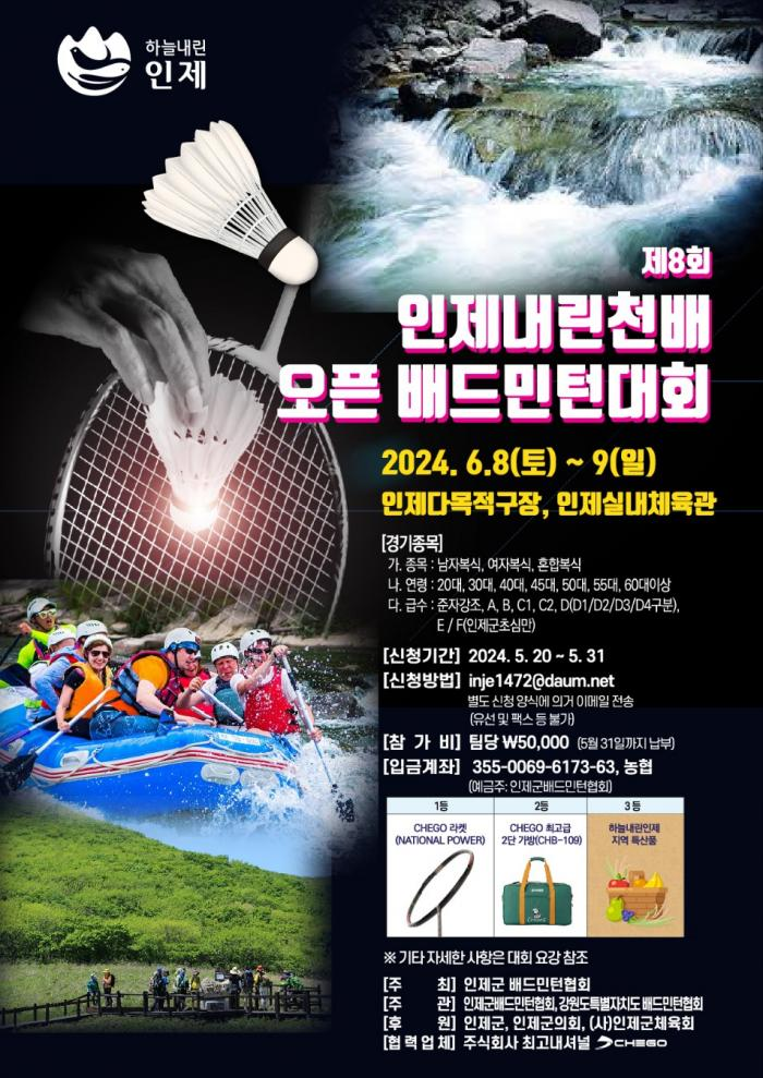 먼저 6월 8일부터 9일까지 ‘제8회 인제내린천배 오픈 배드민턴 대회’가 인제다목적체육관과 인제체육관에서는 개최된다. 인제군배드민턴협회에서 주최하고 인제군이 후원하는 이번 대회에는 1,800명의 배드민턴 동호인들이 참가한다. 경기종목은 남․여 복식, 혼합복식으로 경기는 등급별 예선리그 후 본선 토너먼트로 진행된다.