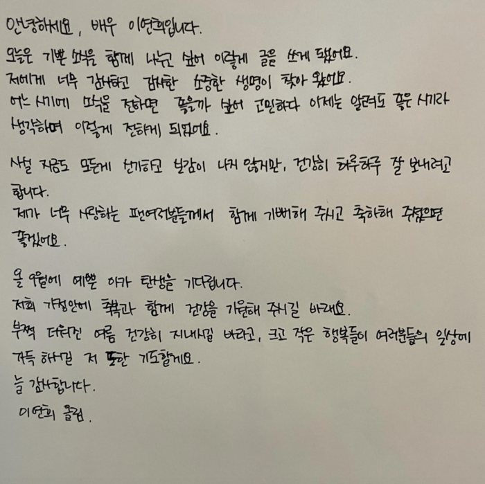 이연희는 “올 9월에 예쁜 아가 탄생을 기다린다. 저희 가정안에 축복과 함께 건강을 기원해주시길 바란다”며 “부쩍 더워진 여름 건강히 지내시길 바라고, 크고 작은 행복들이 여러분들의 일상에 가득하시길 저 또한 기도한다”고 말을 맺었다.