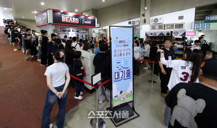 두산 베어스 팬들이 8일 잠실구장 내에 설치된 팝업스토어에서 ‘망그러진곰’ 콜라보 굿즈를 구매하기 위해 줄을 서고 있다.