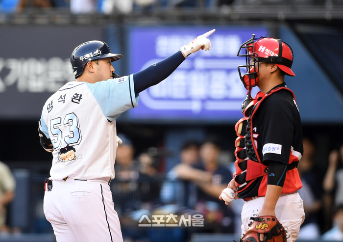 두산 베어스 양석환이 8일 잠실구장에서 열린 2024 KBO리그 KIA 타이거즈와 경기 5회말 무사 KIA 임기영을 상대로 솔로 홈런을 치고 관중석을 가리키며 세리머니를 하고 있다. 양석환의 시즌 16호 홈런. 2024. 6 .8.