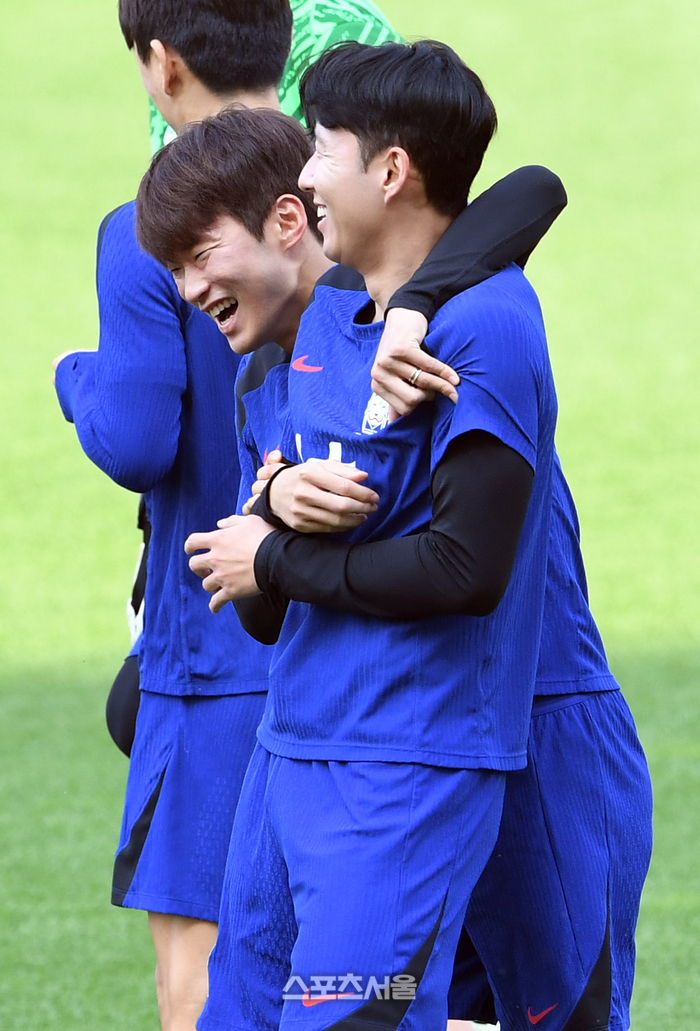 축구국가대표팀의 손흥민(오른쪽)이 월드컵 아시아 지역 예선 중국전을 하루 앞둔 10일 고양종합운동장에서 공식 훈련을 하던 중 김진수와 이야기를 나누며 밝게 웃고 있다. 2024. 6. 10.