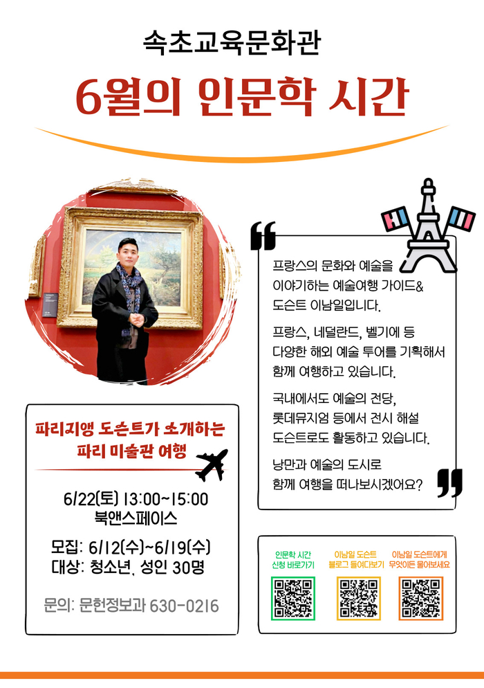 이번 특강은 6월 12일(수)부터 19일(수)까지 속초교육문화관 누리집에서 신청할 수 있다.