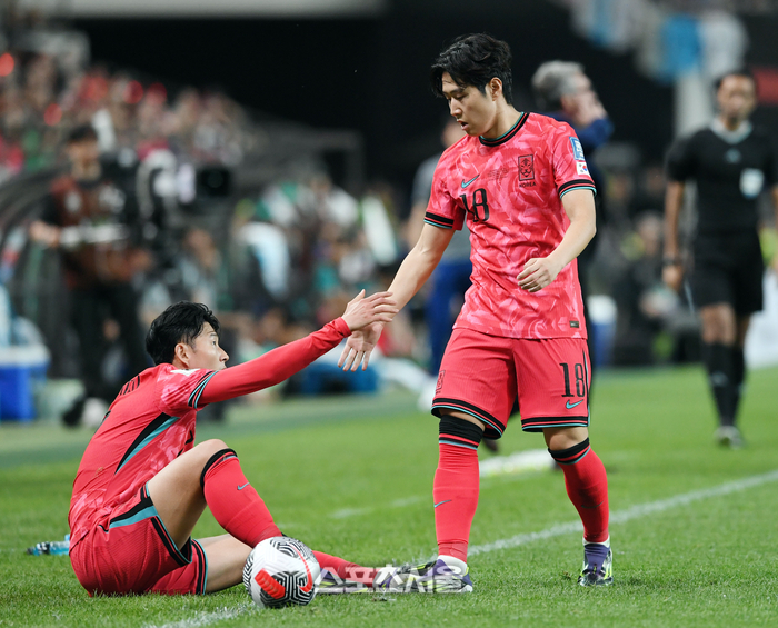 한국 축구국가대표팀의 손흥민(왼쪽)이 11일 서월월드컵경기장에서 열린 월드컵 아시아 지역 예선 중국과의 경기에서 넘어졌다가 이강인의 손을 잡고 일어나고 있다. 2024. 6. 11.