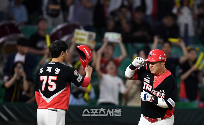 KIA 4번타자 최형우가 11일 인천SSG랜더스필드에서 열리는 2024 프로야구 SSG랜더스와 KIA타이거즈의 경기 7회초 선두타자로 나와 고효준을 상대로 우월1점홈런을 터트린 후 홈인하고 있다. 2024.06.11.