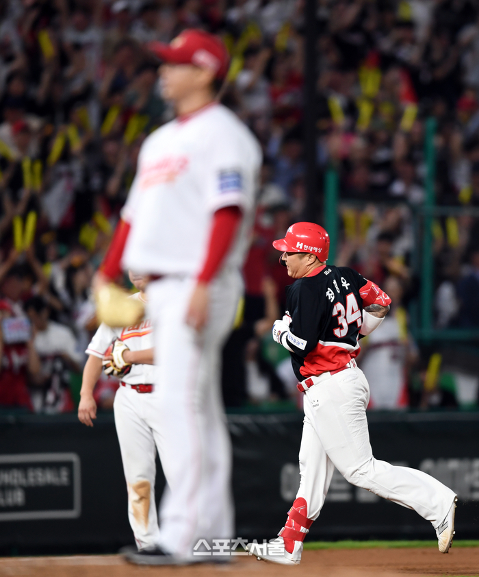 KIA 4번타자 최형우가 11일 인천SSG랜더스필드에서 열리는 2024 프로야구 SSG랜더스와 KIA타이거즈의 경기 7회초 선두타자로 나와 고효준을 상대로 우월1점홈런을 터트린 후 홈인하고 있다. 2024.06.11.