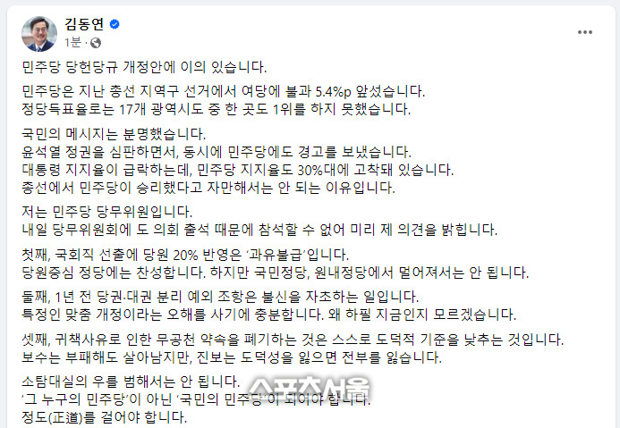 〔스포츠서울│수원=좌승훈기자〕김동연 경기도지사는 11일 자신의 SNS를 통해 ‘민주당 당헌당규 개정안’에 대한 이의를 제기했다.