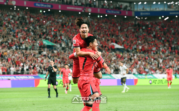 한국 축구국가대표팀의 이강인(위)이 11일 서월월드컵경기장에서 열린 월드컵 아시아 지역 예선 중국과의 경기에서 선제골을 넣은 뒤 손흥민과 함께 기뻐하고 있다. 2024. 6. 11.