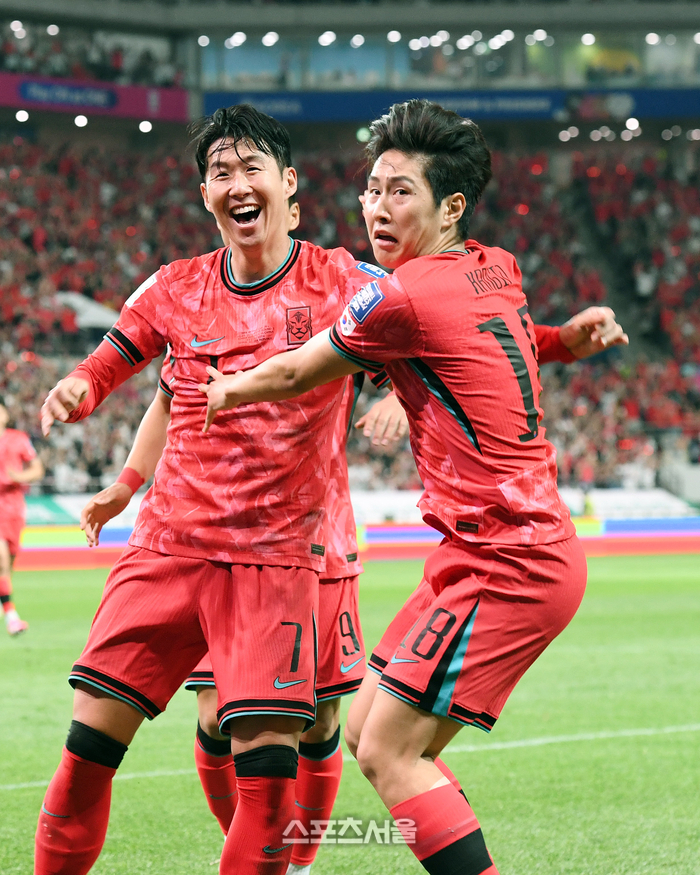 한국 축구국가대표팀의 이강인(오른쪽)이 11일 서월월드컵경기장에서 열린 월드컵 아시아 지역 예선 중국과의 경기에서 선제골을 넣은 뒤 손흥민과 함께 기뻐하고 있다. 2024. 6. 11.