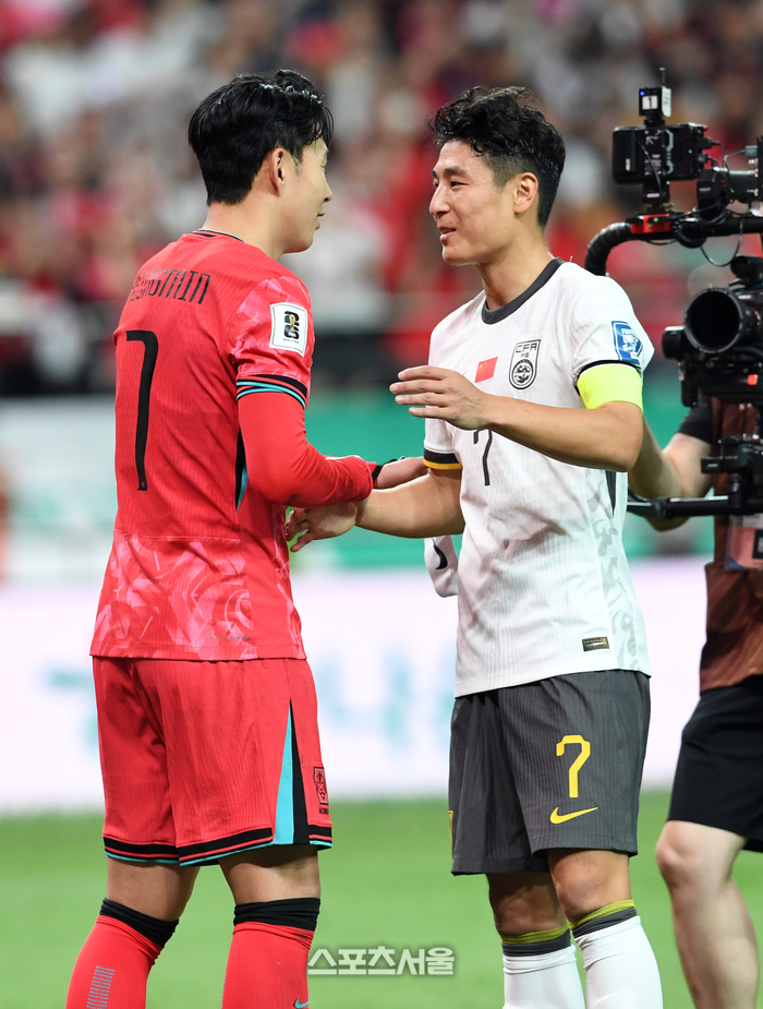 한국 축구국가대표팀의 손흥민(왼쪽)이 11일 서월월드컵경기장에서 열린 월드컵 아시아 지역 예선 중국과의 경기에서 중국에 1-0으로 승리한 뒤 중국의 우 레이와 인사를 하고 있다. 2024. 6. 11.