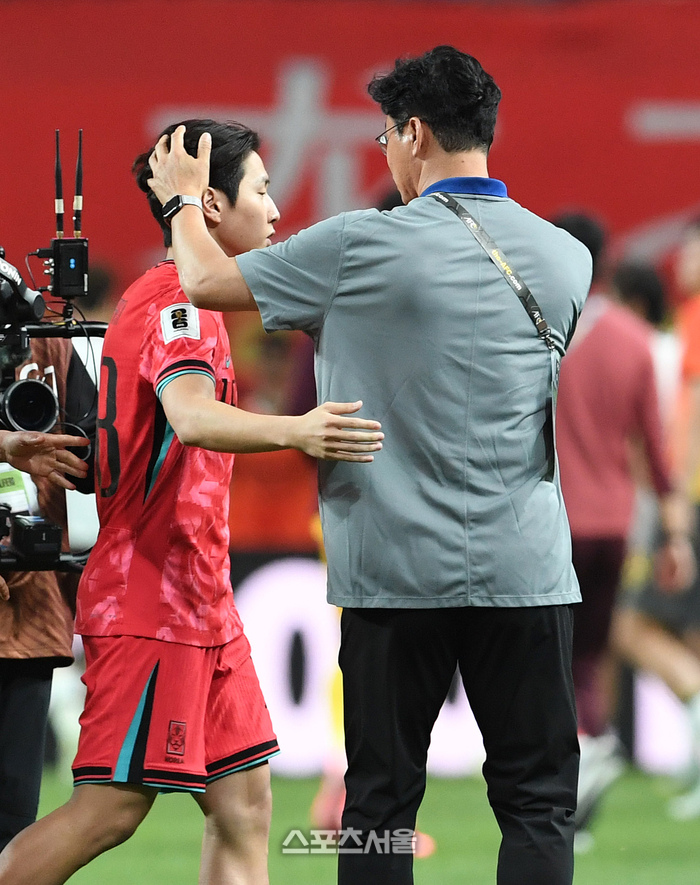 한국 축구국가대표팀의 김도훈 임시 감독(오른쪽)이 11일 서월월드컵경기장에서 열린 월드컵 아시아 지역 예선 중국과의 경기에서 중국에 1-0으로 승리한 뒤 결승골의 주인공 이강인과 하이파이브를 하고 있다. 2024. 6. 11.